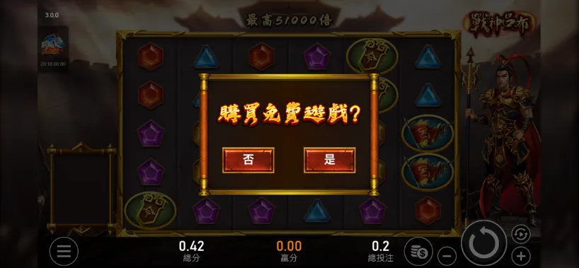 戰神呂布提供直接購買免費遊戲模式,只需以當前投注籌碼的100倍購買,即可立即啟動免費遊戲特色。您最少可享受15次獎勵遊戲,讓您在遊戲中獲得更多的高分機會!立即嘗試,探索這令人興奮的遊戲特色!