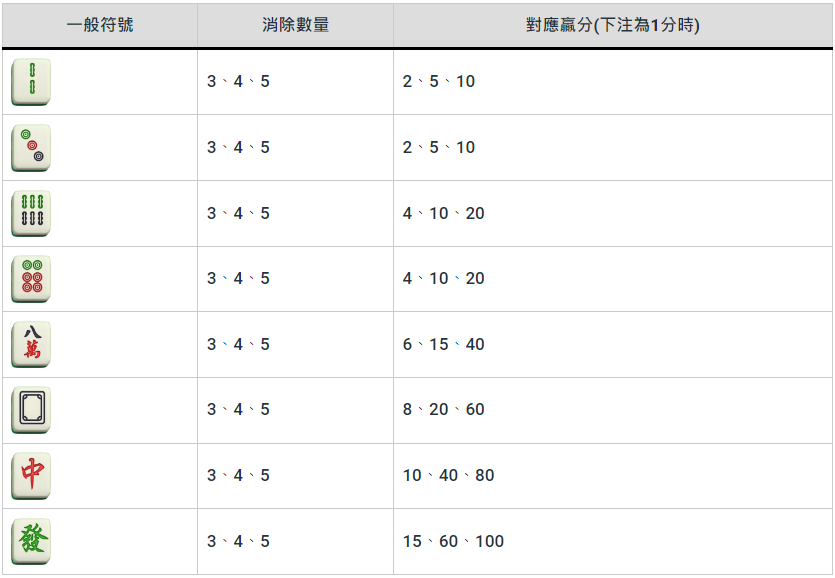 • 獎金方式:全版倍數、消除掉落、轉換百搭