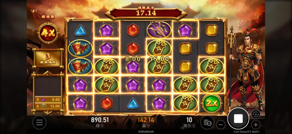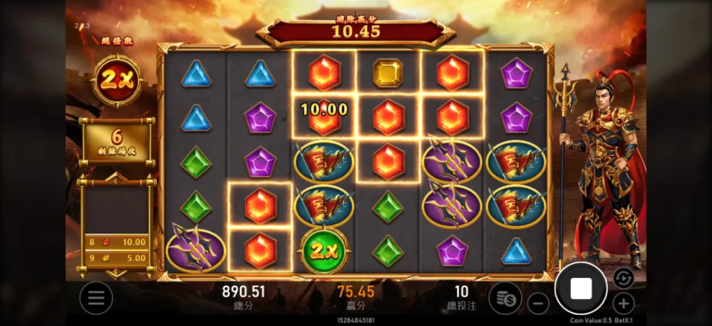 戰神呂布的隨機掉落倍數為遊戲增添了不少樂趣。遊戲中的四色晶球都代表著倍數,只要出現倍數符號,您就有機會獲得2倍至500倍的隨機倍數。當掉落消除結束時,所有倍數符號的倍數將相乘,並乘以您的得分,成為最終的獎金。盡情享受這個帶來豐富獎勵的特色吧!